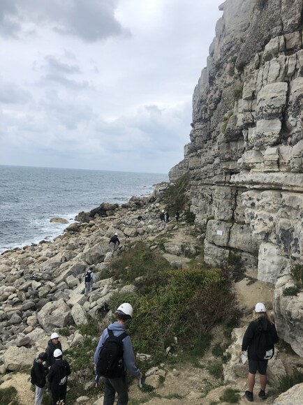 On Friday 26th September the Year 11s braved the M25 'car park' to travel down to Osmington PGL Centre near Weymouth in Dorset. We arrived just in time for the evening meal and went straight in before getting settled and later enjoying some PGL evening activities. On Saturday morning we were in the classroom for some geology, preparing for what we would be doing on the Isle of Portland for the day. We familiarised ourselves with the geology of Portland and its main industry of quarrying limestone. Our first stop was on the north of the island to make observations in our field notebooks about the rocks visible in the rock face. At the very top was the limestone that is quarried, known locally as whit stone. Below this we could see various layers that were either rich in fossils or flint, known as chert and called the Cherty Beds. This would be material that is waste or avoided by the quarrying process and known as roach stone. In Kent a similar rock is called rag stone. We then moved up the coast to look at an old quarry that was dug by hand. The limestone would have been winched on to a ship, which is why all the hand-cut quarries were on the coast. We measured the size of the hole to work out how much limestone had been extracted.