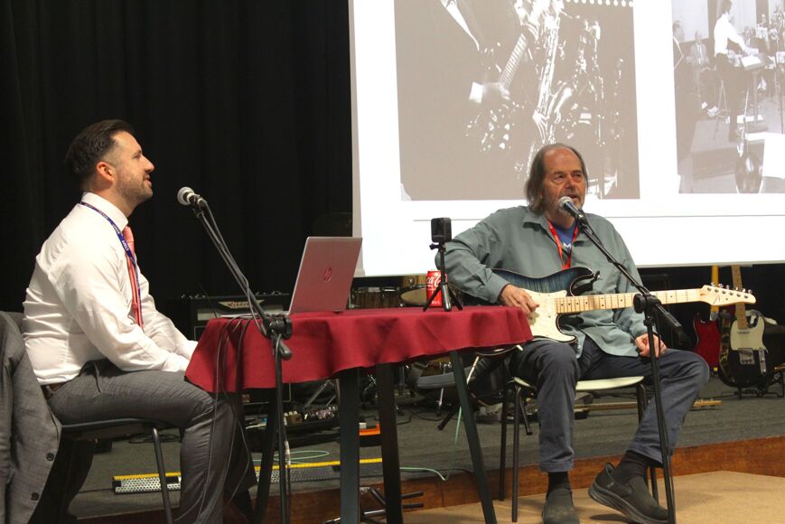 Dr Ray Russell came into school recently to talk to music students from both campuses and provide an insight into the music industry. A session musician and experimental jazz/rock guitarist, Ray Russell is also an award-winning record producer and composer, with a distinguished career spanning over 60 years. He has worked with an extraordinary list of artists including Paul McCartney, Freddie Mercury, Jeff Beck, David Bowie, Van Morrison, Bryan Ferry, Phil Collins, Art Garfunkel, Sting, Eric Clapton, Tina Turner to name but a few. The students loved hearing from Ray and seeing their own music teachers play with such a legend.
